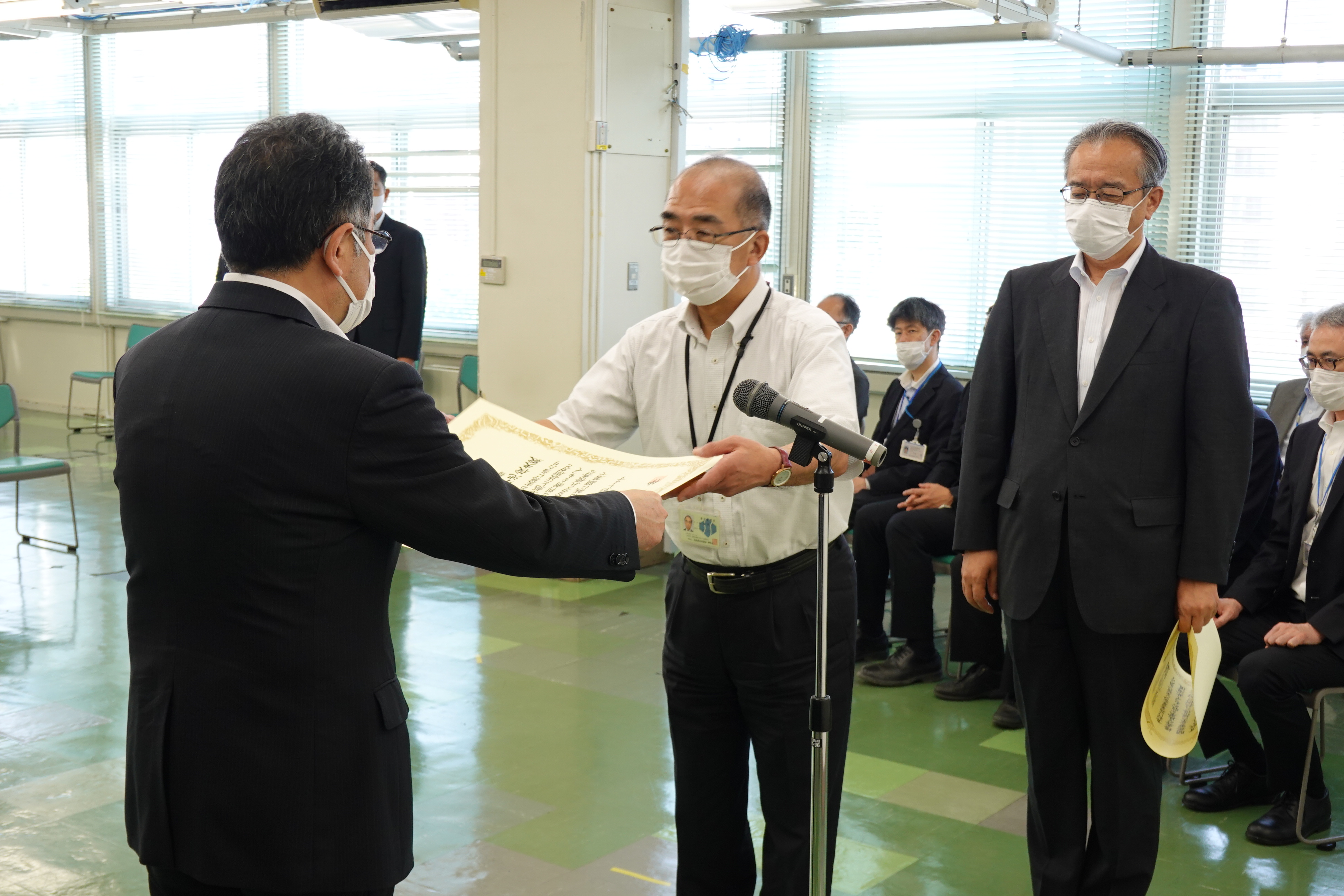 井上勝伸釧路開発建設部部長から表彰を受ける鎌田専務理事